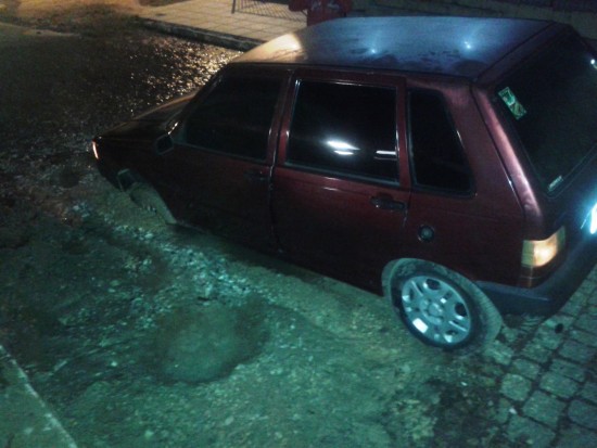 Um Fiat Uno, placas BUO 4227, de Caçapava do Sul, caiu na noite deste domingo, dia 05, em um buraco aberto na rede de água da Corsan.